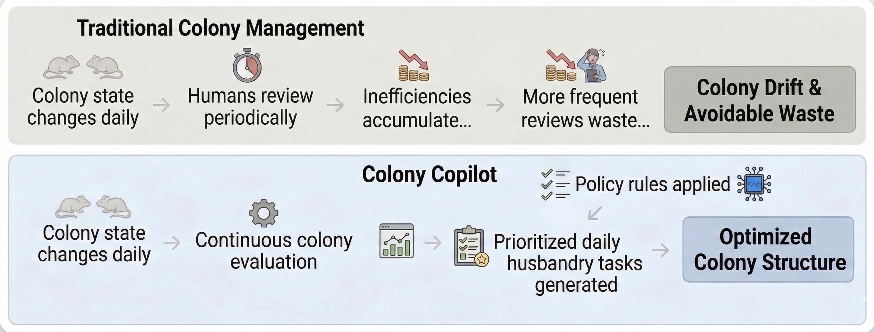 Mouse colonies naturally drift. Litters mature, genotypes resolve, and cages become underfilled as animals cross biological decision points. Manual colony reviews cannot keep up. Routine colony management already requires 5–10 hours per week to review inventories and plan husbandry actions — costing $5,700–$11,400 per year in technician time — yet inefficiencies still accumulate between reviews.In typical colonies, 15–30% of cages represent avoidable housing. In complex interbreeding colonies waste exceeds 40%. At roughly $1 per cage per day, even small occupancy gaps compound quickly into next month's vivarium bill.Colony Copilot stops this drift — continuously evaluating colony state and generating prioritized husbandry actions before costs accumulate.