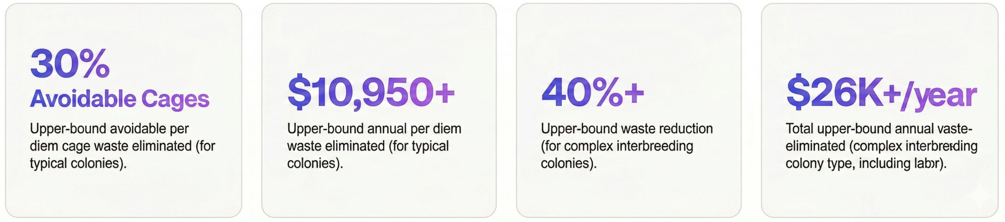 Illustrative savings scenarios for a 100-cage colony suggest that reducing avoidable housing waste and manual colony review burden can represent a meaningful annual cost-saving opportunity. In a typical colony, that opportunity may range from approximately $11,000–$22,000 per year. In more complex interbreeding colonies, the potential may exceed $20,000–$26,000+ per year.